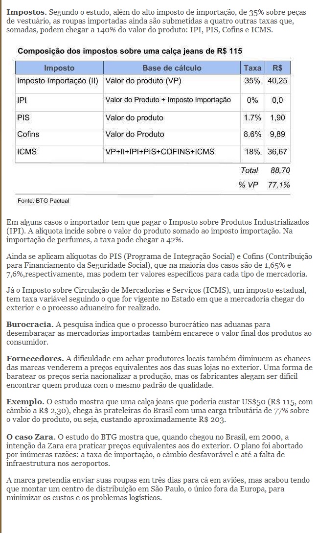 Dentro deste cenário, o imposto é o que representa a maior parcela no aumento do produto. “Segundo o estudo, além do alto imposto de importação, de 35% sobre peças de vestuário, as roupas importadas ainda são submetidas a quatro outras taxas que, somadas, podem chegar a 140% do valor do produto: IPI, PIS, Cofins e ICMS.”