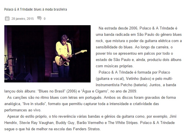 A banda Polaco & A Trindade está, desde 2006, no cenário alternativo com uma proposta diferente: tocar Blues, ritmo nascido nos Estados Unidos, com letras (autorais) em português. O resultado desta mistura é um som eletrizante, que não perde a sensibilidade do gênero idealizado por B.B. King, Ray Charles e outros mestres.